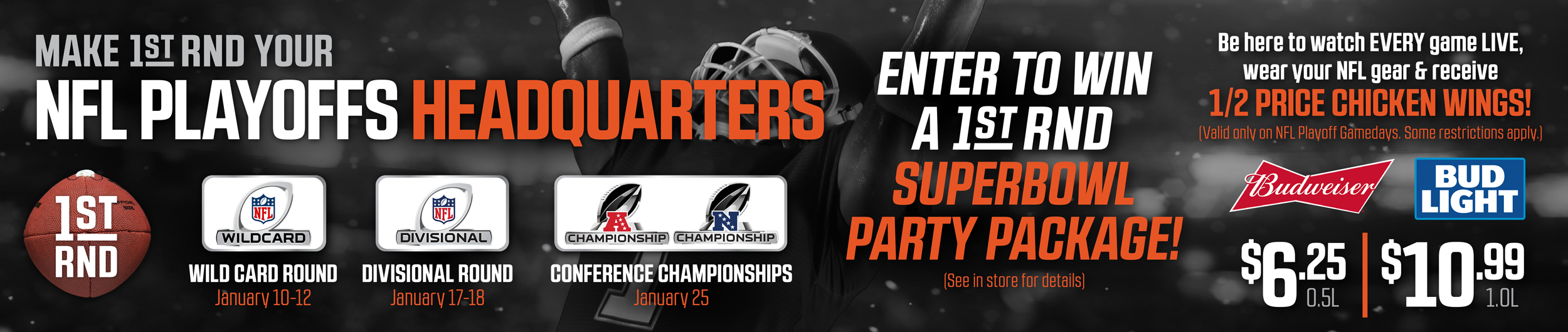 Join us at 1st RND to watch every single NFL playoff game live! Enjoy Budweiser and Bud Light gameday draught specials. Wear NFL gear during any playoff broadcast and you will receive half-price chicken wings. You can also enter to win a 1st RND Super Bowl party package! Call now to book your reservation and secure your spot for the ultimate playoff experience and make 1st RND your NFL playoff headquarters!!