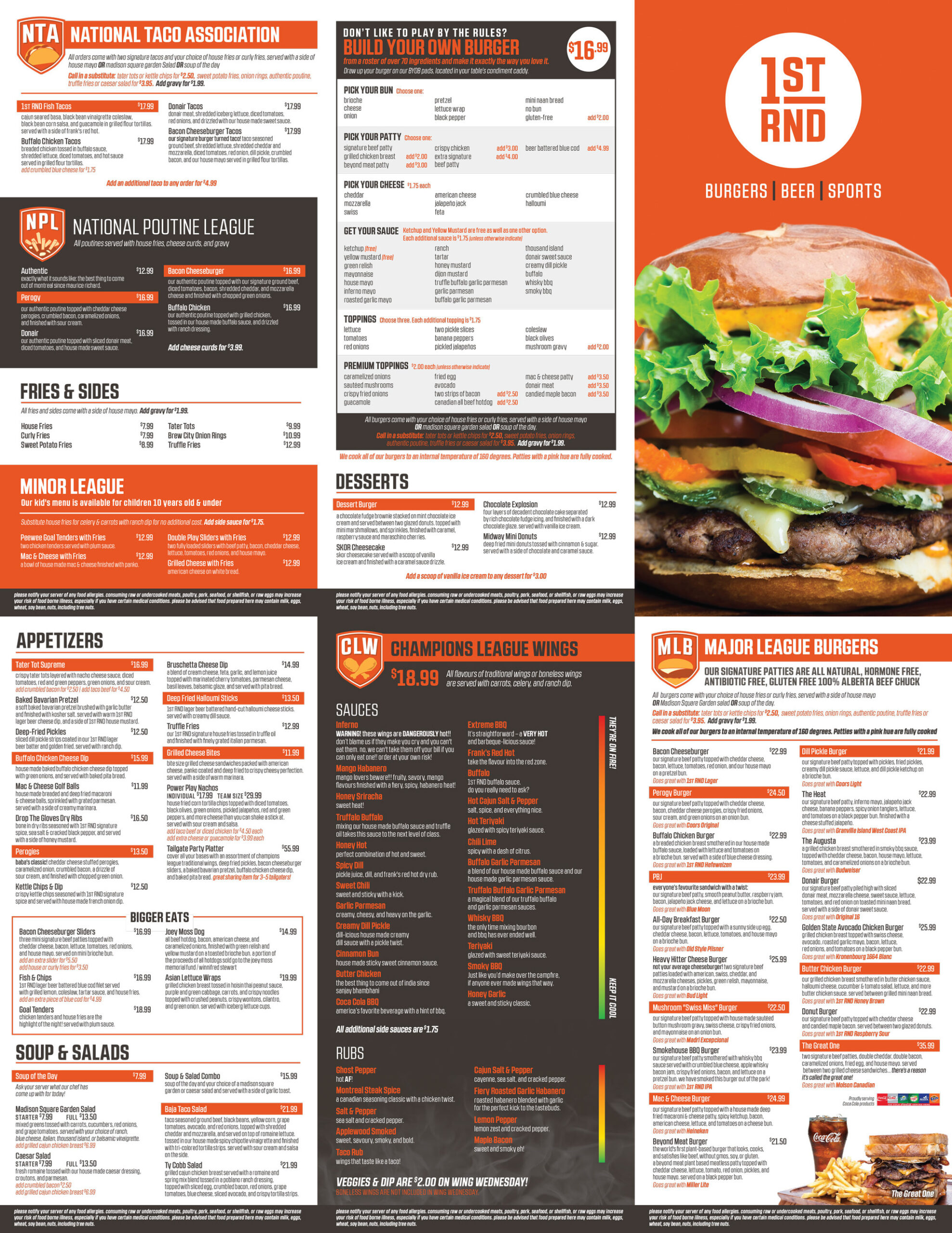 Our menu is first in the league. Order wings and nachos to share with your teammates, but keep one of our all-star burgers all for yourself. Take your meal into overtime with something from our dessert menu!